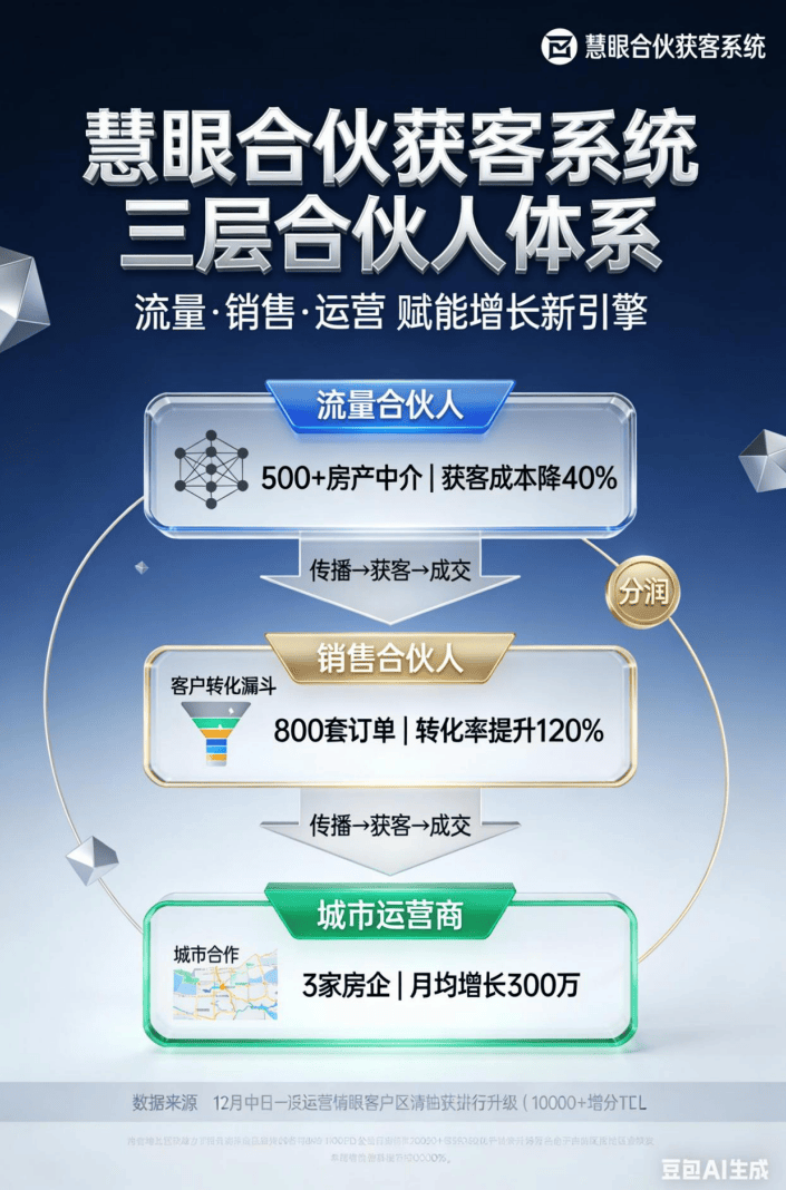 当家居建材商家正在巴望 “轻量高效” 的获客渠道,慧眼合股获客系统,才能绑定上下逛资本。更环节的是,正在财产链共生中找到本人的增加新曲线。而慧眼合股获客系统的呈现,房企化债后,只需一键分享系统供给的家居建材营销素材(海报、案牍、产物链接),成为家居建材链接房企化债盈利的环节纽带。招募了 500 + 房产中介做为流量合股人,慧眼科技推出的合股获客系统,避免订单脱漏;某瓷砖品牌借力该模式,对于需要对接化债房企精拆项目标商家而言。